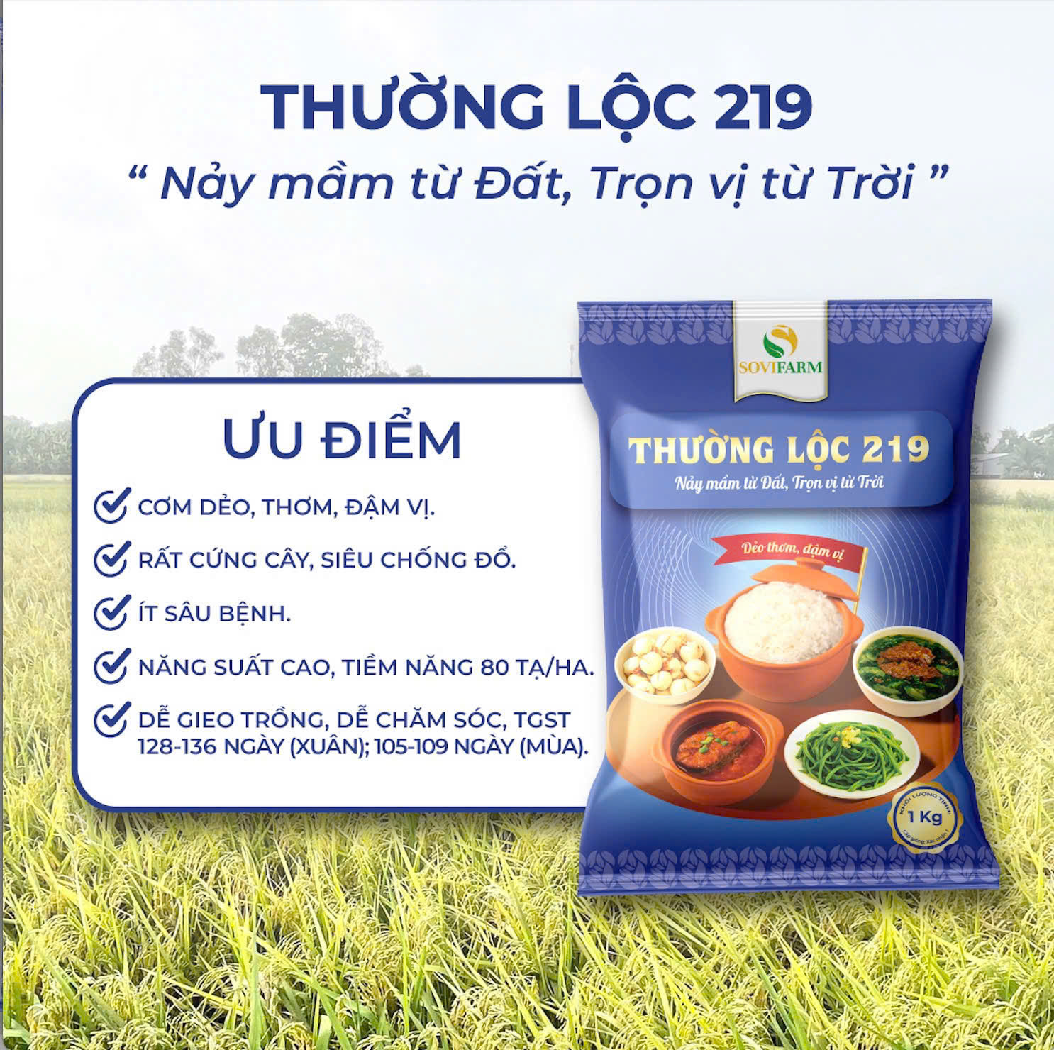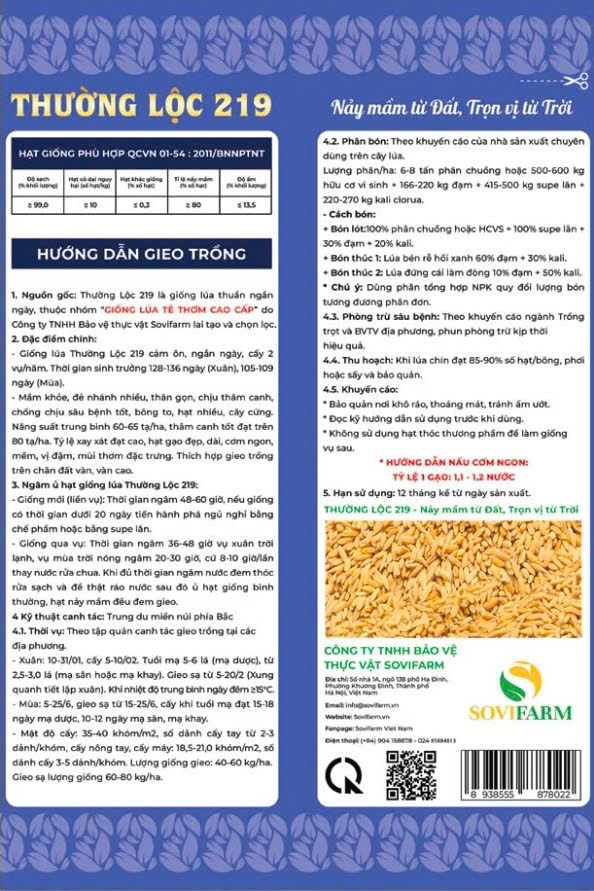Thường Lộc 219 là giống lúa thuần ngắn ngày, chất lượng cao do Công ty TNHH Bảo vệ thực vật Sovifarm lai tạo và chọn lọc